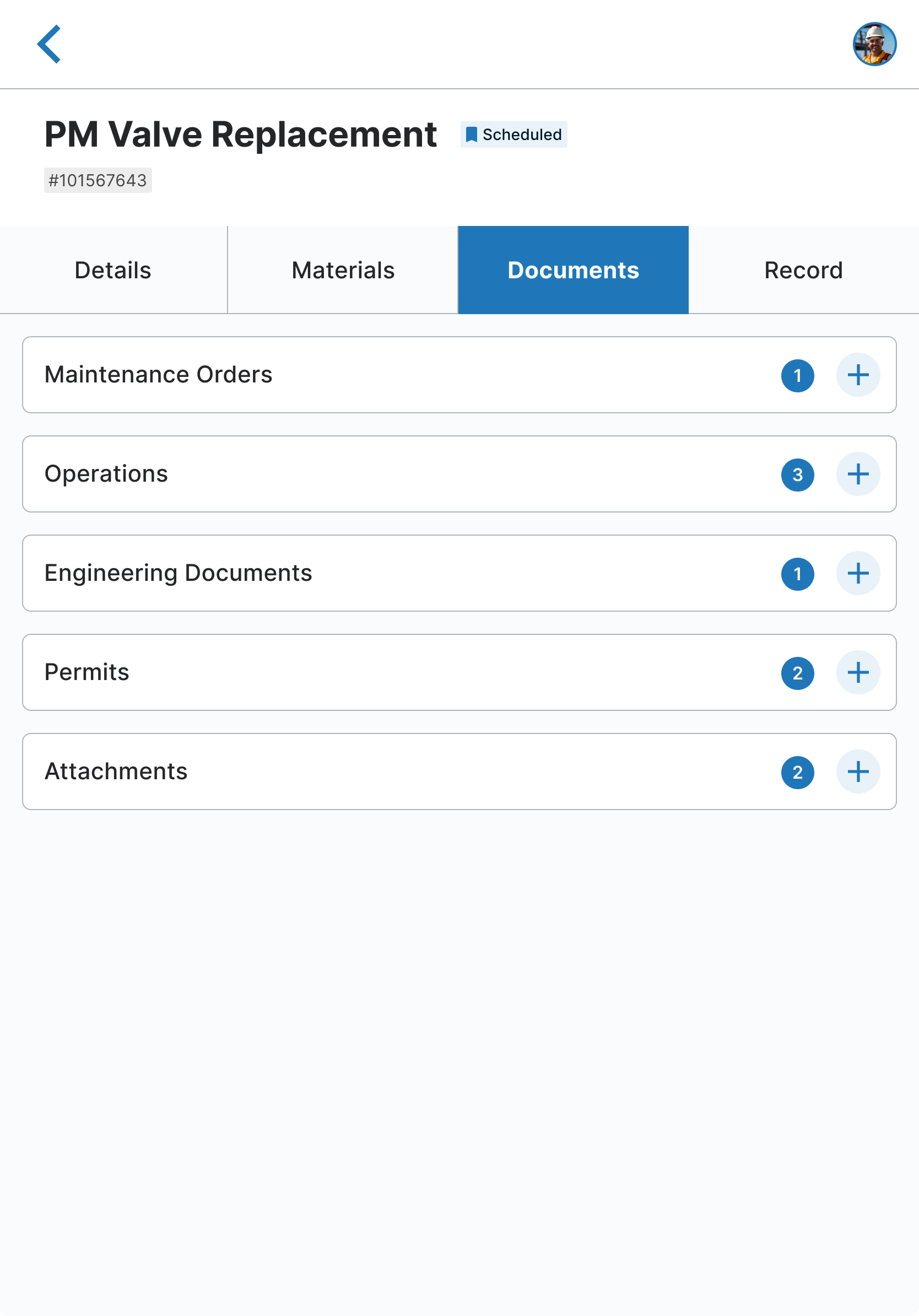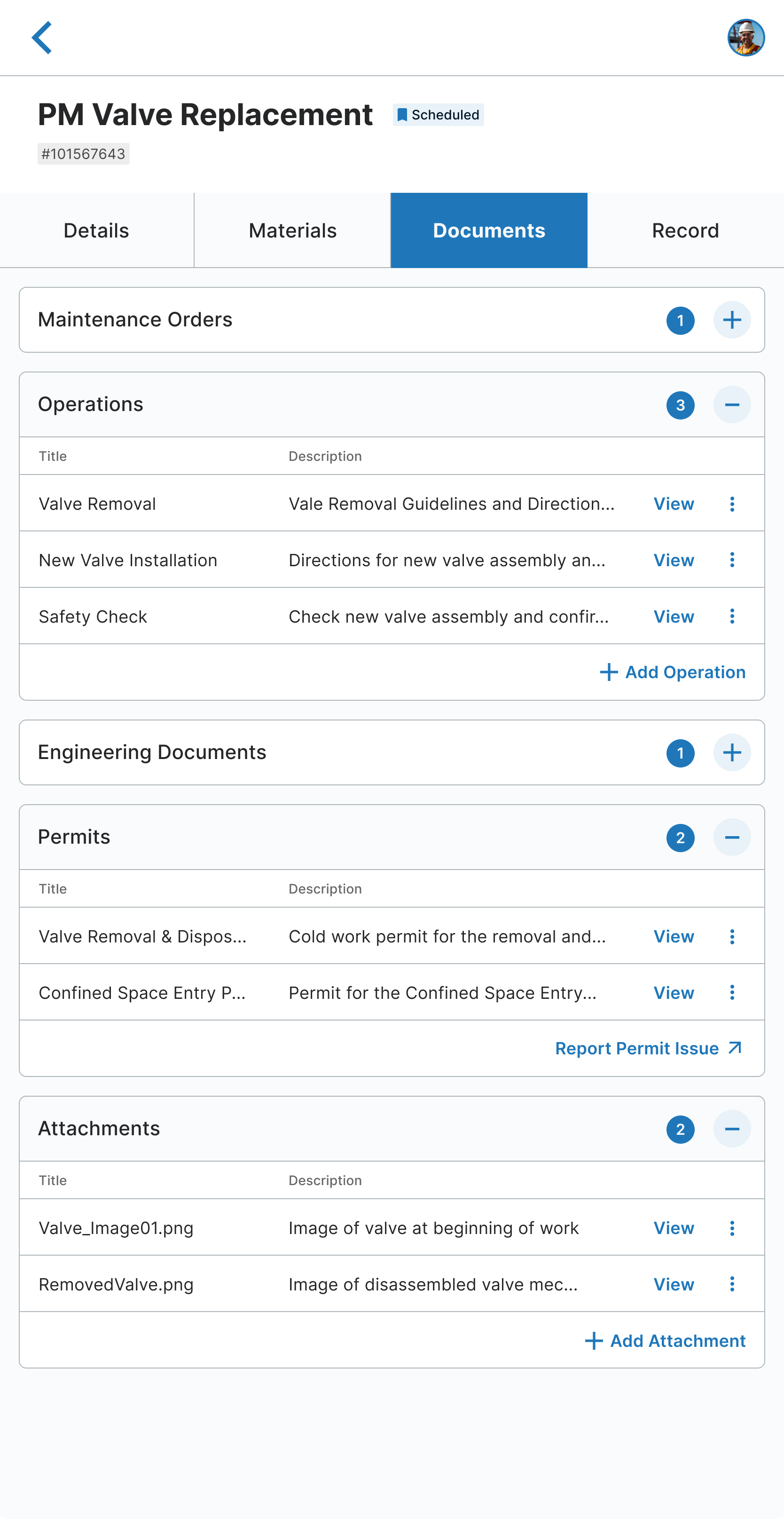 01 Document section of the Maintenance Order - where users can access all documents needed for the order (incl. permits, engineering files, instructions, etc.) 02 Document section with Attachments expanded