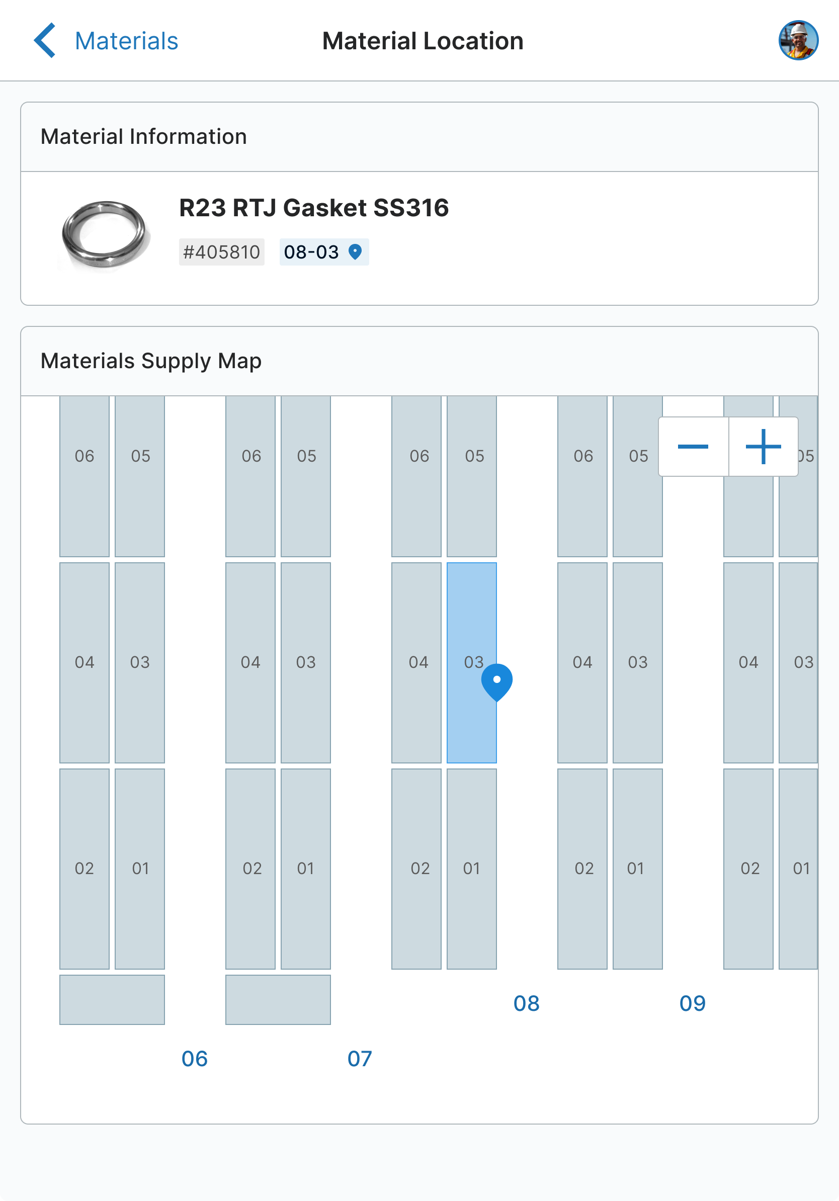01 Materials section of the Maintenance Order - where user reviews all materials (tools, parts, etc.) needed for order 02 Material Detail Page to view material specs 03 Map view of location of material in storage