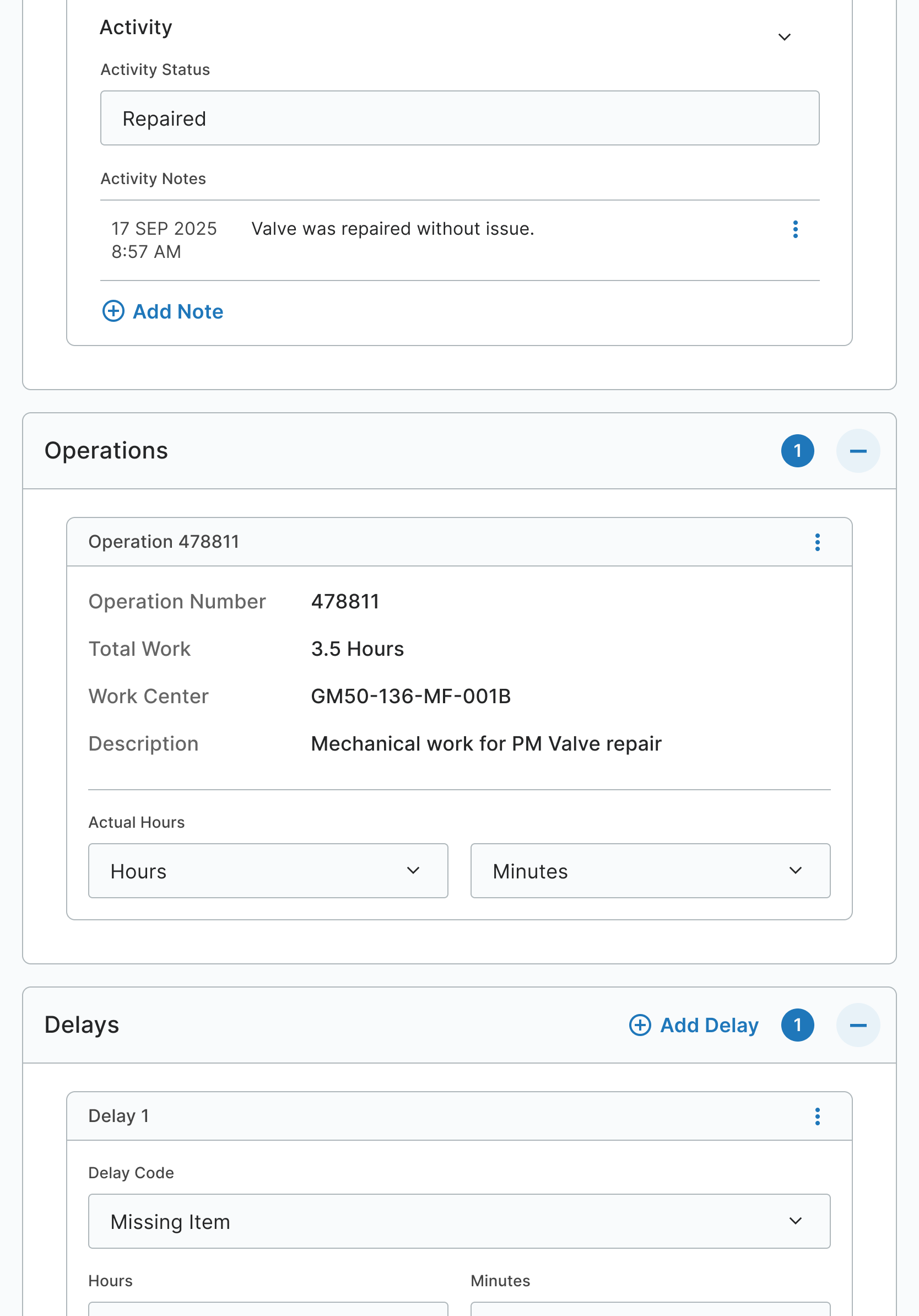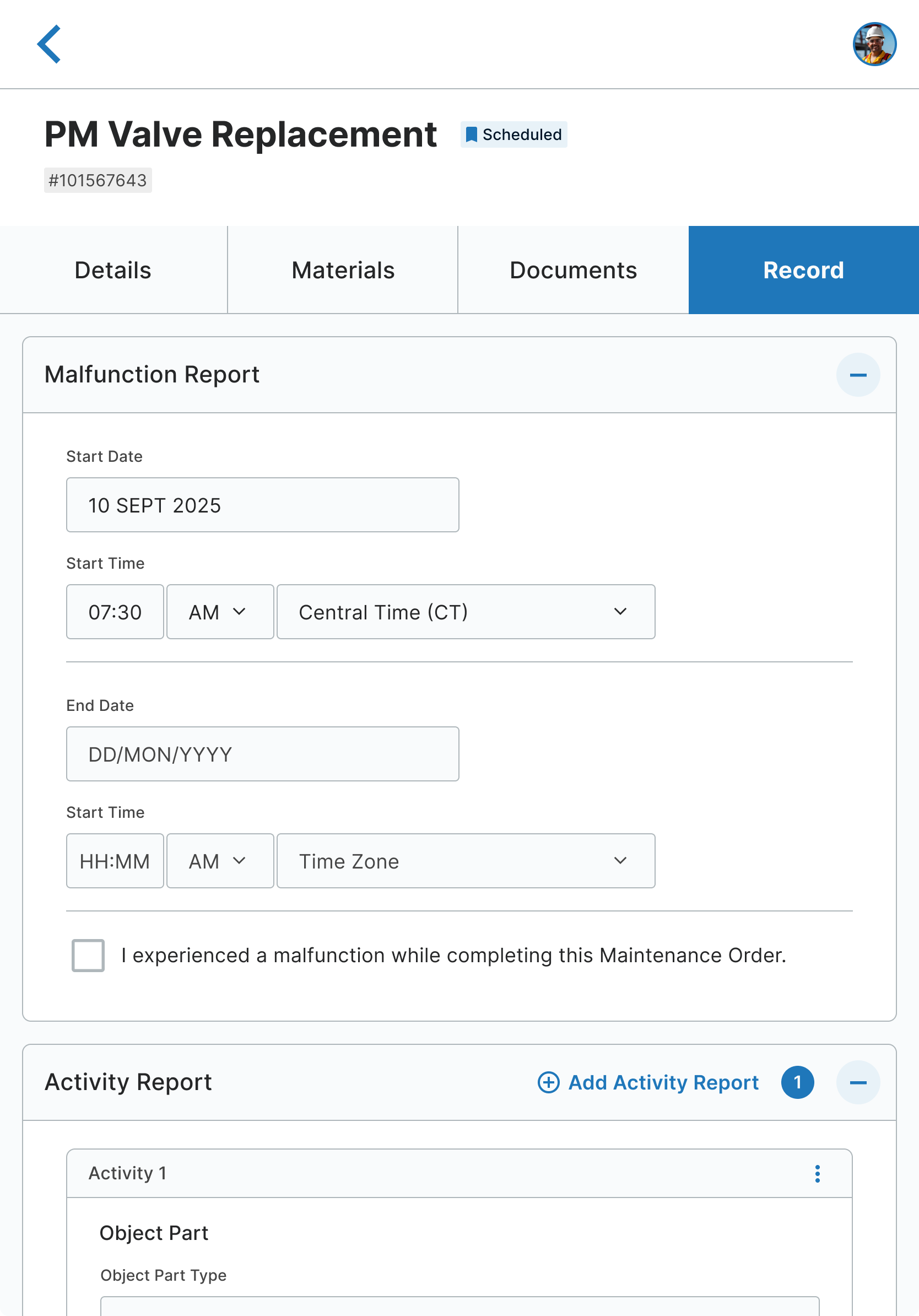 01-03 The Record section of the Maintenance Order - this is where users will record details about the entire maintenance order - things like delays, meter readings, time of task completion, and more
