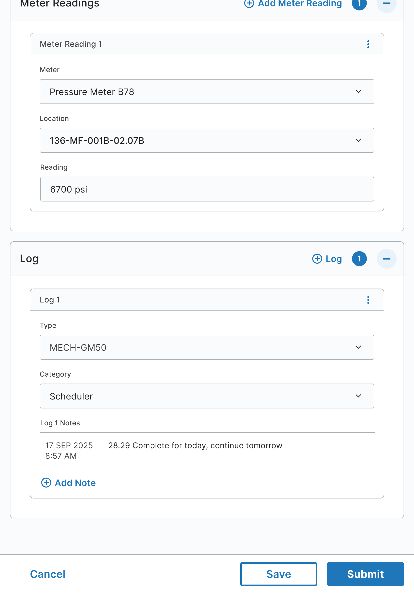 Technicians will complete their work by entering data and notes in the final section: Record. There they’ll enter malfunction details, delays, tasks performed, meter readings, and lastly, if the work is completed.